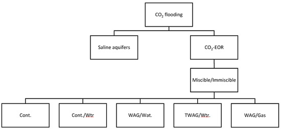 CO2 flooding processes can be classified into miscible and immiscible, although CO2 is not immediately miscible upon first contact with oil in the reservoir. CO2 is, in general, soluble in crude oil at reservoir pressures above its minimum miscibility pressure (MMP—defined as the lowest pressure at which dynamic miscibility develops between oil and the solvent, i.e., injected CO2 [87,130]) but the process is achieved after multiple contact miscibility processes [131]. Miscible CO2 flooding effectively increases production rates and recovery and extends the economic life of assets [84]. As such, one must always consider the average reservoir pressure before CO2 flooding versus MMP [132]. Miscibility depends on reservoir pressure, depth, and API gravity [133]. In such cases, immiscible CO2 flooding may be a viable alternative [134]. Adel et al. [135] conducted several experimental gravity-stable CO2 floods below and above MMP to determine the oil recovery factor. Although all miscibility conditions produced good recovery factors due to the gravity-stable floods, those above MMP resulted in a better recovery factor (98%) than those below MMP (89%). Due to the lower density and viscosity of CO2 than oil or water, CO2 rises to the top of the reservoir, resulting in fingering and poor volumetric sweep efficiency [135,136]. Figure 3 provides a summary of CO2 flooding methods.