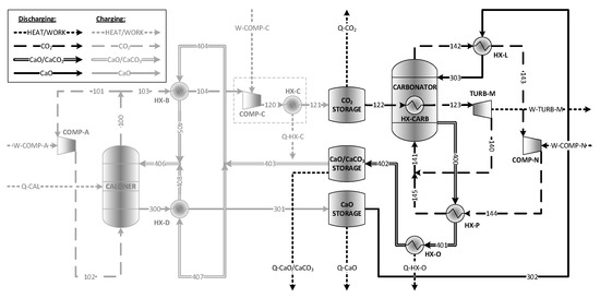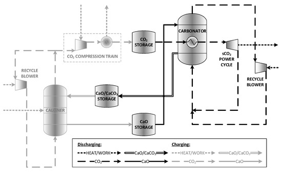 CO2 is stored under supercritical conditions at 7500 kPa (g) and ambient temperature in the CO2 storage tank, while CaO is stored at atmospheric pressure in the CaO storage tank. CaO enters the carbonator, where it undergoes a carbonation reaction with CO2 to produce CaCO3, as per Equation (2). The produced CaO/CaCO3 stream is then sent to storage in the CaO/CaCO3 storage tank. The unreacted CO2 exiting the carbonator is recycled.