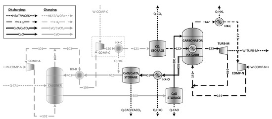 For the purposes of comparison with similar systems being proposed, in this model, the energy input to the calciner is coming from CSP, and the carbonator is operated continuously with the calciner operating for 12 h in a 24 h period. However, the process configuration would be suitable for storing energy derived from any source operating at sufficiently high temperature to drive the calcination reaction. This could potentially include storing energy coming directly from the electricity grid via electrical heating in a fluidized bed calciner.
