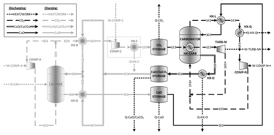 Process flow diagram for Configuration 1; Hot CaO storage and cold CaO/CaCO3 storage.