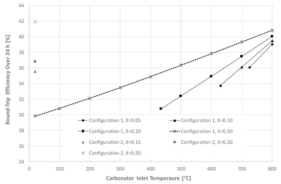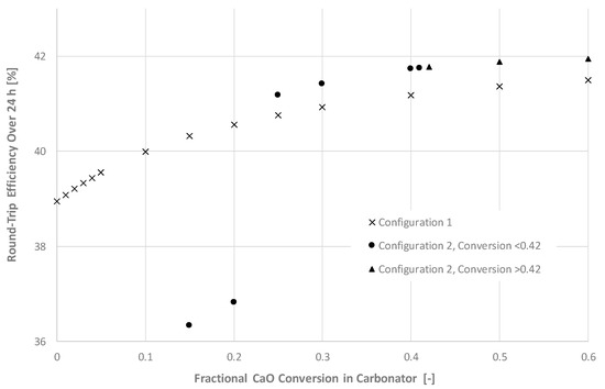 An analysis was conducted on the effect of CaO conversion in the carbonator on the round-trip efficiency over a 24 h period. The efficiency of the supercritical steam cycle operating with the heat extracted in HX-L, HX-O, and HX-Q was fixed at 40%, based on conventional and state-of-the-art steam cycle efficiencies [23]. The results of this analysis are presented in Figure 5.