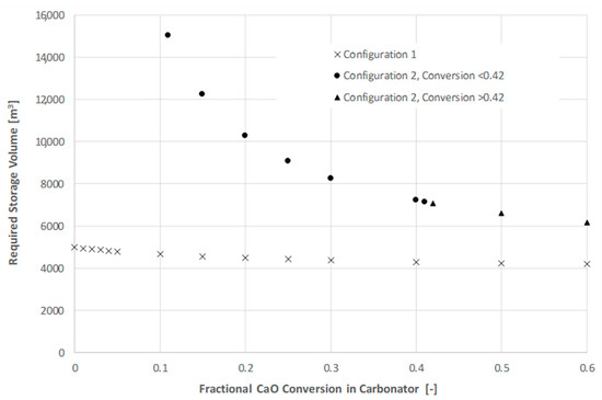 The effect of CaO conversion on the quantity of solids circulating in the process, and, thus, the required storage volume, was also investigated. Figure 6 presents the required storage volume in Configuration 1 vs. Configuration 2 as a function of fractional CaO conversion in the carbonator.