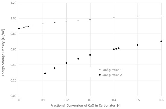 Figure 7 presents the energy storage density as a function of carbonation conversion for both Configuration 1 and Configuration 2. The results are comparable to those obtained by Ortiz et al. [14], with the storage density ranging from 0.8–1.0 GJ/m3 for Configuration 1 and 0.3–0.7 GJ/m3 for Configuration 2.