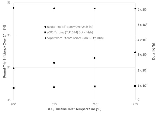 A sensitivity analysis was conducted on the inlet temperature to TURB-M, the sCO2 turbine on the carbonator side, in Configuration 1. Temperature was varied from 600 to 750 °C, based on typical and advanced operating temperatures of sCO2 power cycles [34] Results are presented in Figure 8.