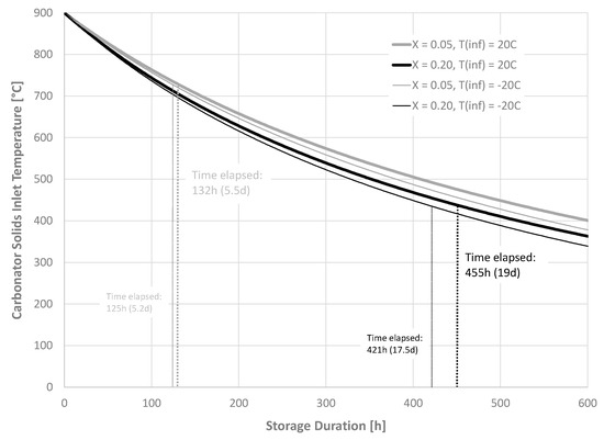 As noted in Section 1, the residual carbonation conversion of CaO has been studied extensively for applications in both CO2 capture from combustion facilities and energy storage in CSP facilities. Much of the work conducted has been performed via TGA. Studies indicate that although CaO carbonation conversion drops rapidly under CO2 capture conditions for combustion applications, higher values of residual conversion may be attained under energy storage conditions [29]. However, the conditions considered for energy storage often include calcination under gas mixtures, including helium or steam, allowing for lower calcination temperatures due to the lower partial pressure of CO2 in the gas mixture. These calcination conditions are not reflected in many of the process analyses conducted [15,30], which, instead, employ a 100% CO2 atmosphere at 900 °C. Under these conditions, sorbent deactivation can be expected to be similar to that observed in CO2 capture processes. The residual carbonation conversion will also typically be lower in full-scale operation than in TGA testing, due to the impacts of particle thermal stresses from operating the calciner as a fluidized bed. For example, pilot testing conducted over a 4 h period in a 100 kWth calciner at 910 °C and under a 75% CO2/5% N2/20% O2 atmosphere yielded a residual carbonation conversion of 0.07 [31]. Pilot testing conducted at the 1 MWth scale over several days, in which the calciner was operated as an oxy-fired combustor with recirculated flue gas, yielded a residual carbonation conversion below 0.05 [32].