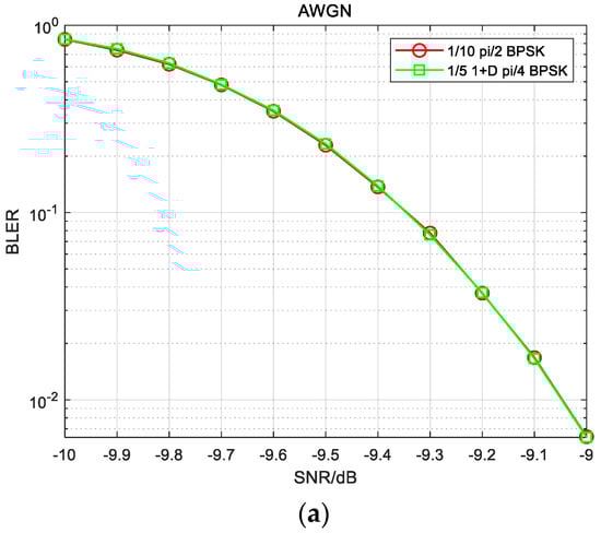 The simulation parameters are shown in Table 6 and the simulation results are shown in Figure 6. It can be found that the performance of both modulation schemes is the same, that is, there is no performance loss in (1 + D) pi/4 BPSK. For the (1 + D) pi/4 BPSK, this is mainly because it is equivalent to sending data repeatedly; by increasing the bit rate, the performance is reduced. These two concerns affect each other, leading to the final performance unchanged. It should be mentioned that in some cases, different coding gains may be generated due to different bit rates, but this is not our main concern. Therefore, it is generally believed that (1 + D) pi/4 BPSK is recommended under low bit rate and AWGN channel.