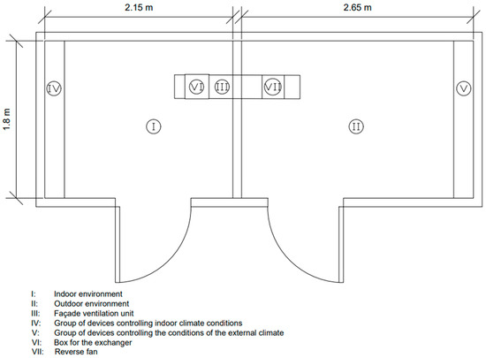 Experimental studies were carried out in the Laboratory of Building Physics, Solar and Hydro Power Engineering of the Kielce University of Technology. The study was intended to analyse the operation of a decentralised room ventilation unit designed to improve indoor air quality while reducing energy loss through heat recovery. The façade ventilation unit was equipped with a reversible fan and a chamber for the heat exchanger so that different solutions implementing heat recovery could be tested. As shown in Figure 1, the device was mounted in a baffle, located in the climate chamber, which allowed to modify both the internal and external conditions. Table 1 shows the parameters of the climate chamber.