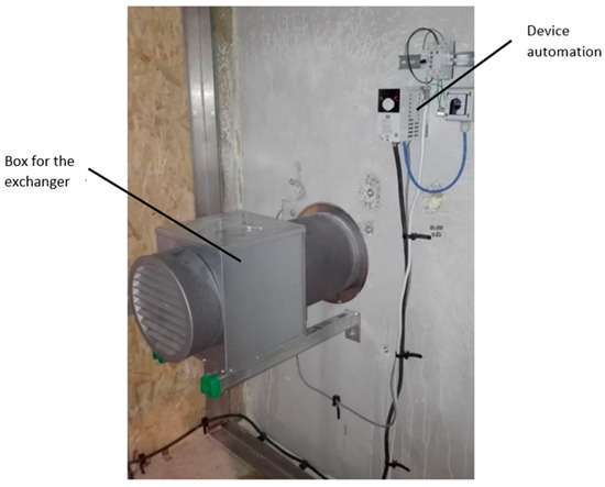 A 250 mm diameter ventilation duct feeds/removes air through a ventilation grille at a height of 1 m above the floor. The stand does not constitute a real ventilation system, it only allows for the assessment of heat recovery efficiency. It is an innovative solution and the heat exchanger itself has been granted a protection right for a utility model under the number P.432536 [33]. The chamber for the exchanger is 255 mm long, 260 mm wide and 300 mm high.