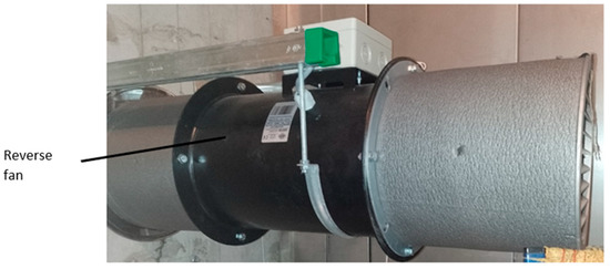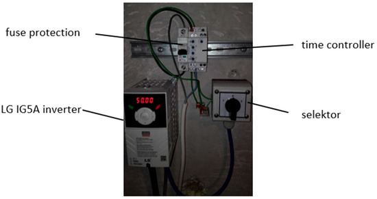 The façade ventilation unit, thanks to its integrated reversible fan Ventur ARC4-250C-012T from Venture Industries, operates in cycles, alternating between supply and exhaust. An automated control system was used to manage the timed cycles, allowing specific durations of the supply and exhaust cycles to be set. The analysis included the operation of the unit in cycles of 1 min, 2 min, 3 min and 5 min. The automated control system (Figure 4) regulates the fan frequency so that the flow rate can be controlled. A frequency of 50 Hz was used for the tests, which translates into a flow velocity of approximately 2 m/s. The air flow is 353 m3/h.