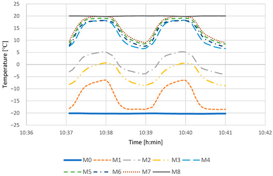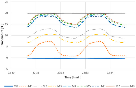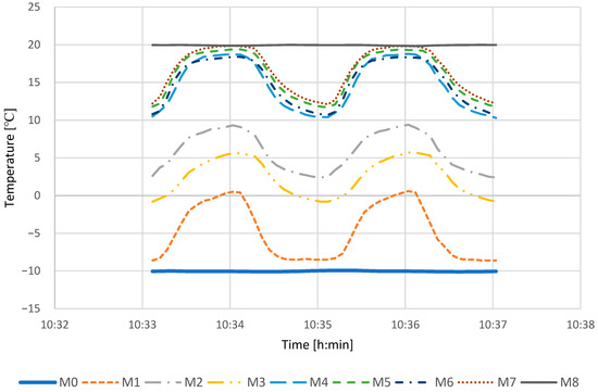 Change in temperature in measuring points marked M0–M8, when the first heat exchanger, filled with jojoba oil, was used. The external temperature equals −20 °C and internal temperature equals 20 °C. The supply and exhaust cycles were 1 min. Temperature change wave.