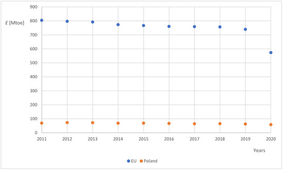 A separate item in the balance of resources is waste wood in the economy. It should be taken into account that out of every 100 m3 of wood mass harvested in the forest, 10 m3 is used for bark, 15 m3 is used for brushwood, 20 m3 is used for fuel roughage, 19 m3 is used for sawdust and edgings, 36 m3 is used for sawn timber and 20–25 m3 is used for finished wood products from the “sawn timber” item [30]. Analyses have shown that there is no possibility of a greater increase in the amount of waste wood in Poland, unless there is a wider introduction of fast-growing tree plantations: poplar and shrub willow [31,32]. If 4/5 is deducted from the harvested 20 million m3 of wood per year for waste, then 16 million m3 of wood will be obtained annually for possible disposal. Thus, the wood resources for energy use amount to approximately 16 million m3. The average density of firewood is 450 kg in 1 m3 [33], so the resources amount to 7.2 million Mg of wood per year, which is the equivalent of about 4 million Mg of hard coal [34]. The use of wood for energy purposes in Poland was estimated at over 1.5 million Mg in 2000 [35].