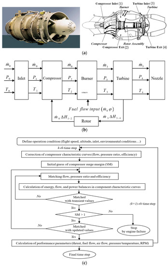 The target model was a one-spool turbojet engine with a 4500 N thrust level, which is shown in Figure 1a. Its mathematical model, which precisely reflects the real engine, was employed from the component characteristic data maps developed by the GPA with the component level model (CLM) [3,4,29], which is shown in Figure 1b. Detailed descriptions of the overall cycle analysis are omitted for brevity. Some primary relations peculiar to the turbojet engine are presented here.