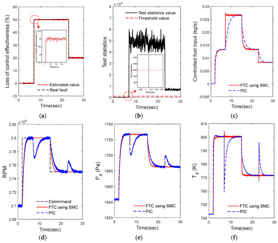 For FD schemes including FDI using test statistics, the actuator fault is addressed as an unbiased estimator with a state vector, and the estimations of sensor faults are performed using two approaches: GLR [25,28] and the pseudo actuator model (PAM) [5,12,13,14,16]. Here, for FTC laws, the integral-type SMC-based AFTC was adopted with an accommodation scheme for the actuator fault. For the FTC of the fault of RPM sensors in an SMC control loop, the supervisory approach was employed in conjunction with the FD scheme.
