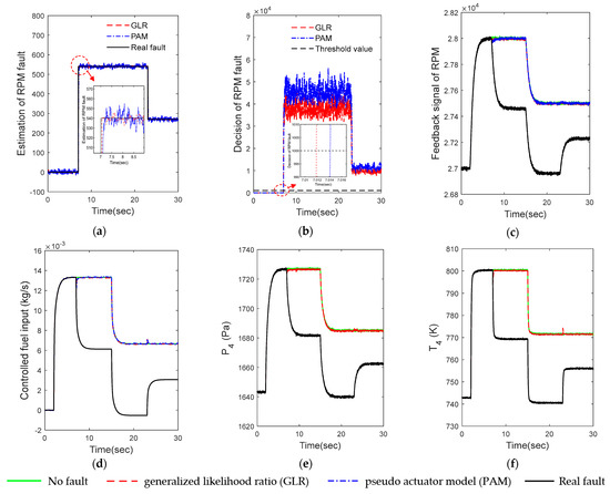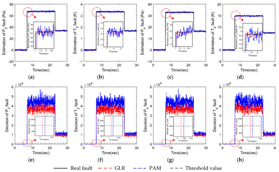 The FD results of other sensor faults, except the RPM sensor, are presented in Figure 5. To save space, all cases of a single fault in each sensor were given in one figure by omitting figures of the unfaulted sensors. Figure 5a–h shows good estimates of FD and FDI performances, respectively, as confirmed by the magnified views. In the figures, the values of the test statistics far exceeded the threshold levels with fast detection speeds, with no possibility of false alarms. In Figure 5a–d, both approaches demonstrate excellent estimation results for each sensor fault, which validated the effectiveness of the proposed FD methods. The GLR approach had a slightly more rapid detection speed and better accuracy than PAM.