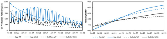 Test runs were also performed to test the performance of both reservoirs. A waterflooding study was performed to see the field performance compared to CO2-WAG. Figure 5 shows the results for both reservoirs. A higher recovery is seen when CO2-WAG is applied (3 months half-cycle, 6000 sm3/day field water injection rate, and 0.9 Msm3/day field gas injection rate) compared to waterflooding (3000 sm3/day field injection rate).