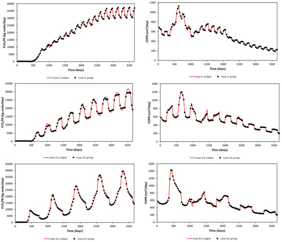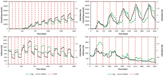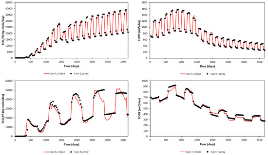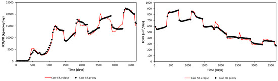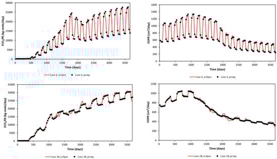 A significant error can be seen in the maximum and minimum of FCO2PR. This is due to the error obtained at early times (first year), as the difference in small value leads to a significant error calculated in APRE term. Nevertheless, FCO2PT (Field CO2 Produced Total) should be the focus, as it will be used in the optimization study. The proxy and reservoir model results (selected randomly) are shown in Figure 7 for the Egg Model and Figure 8 for the Gullfaks Model.