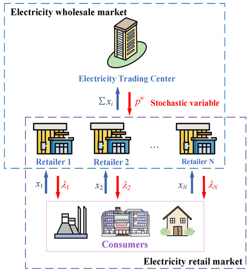 - As shown in Figure 1, retailers are intermediaries between the electricity wholesale market and consumers. In the wholesale market, retailers purchase electricity at wholesale price. Because the competition in the wholesale market is unpredictable, the wholesale price is treated as a stochastic variable. In the retail market, retailers sell what they buy to consumers. Through the bidding process, retailers send the retail prices to customers, and the customers should send the load to retailers.
