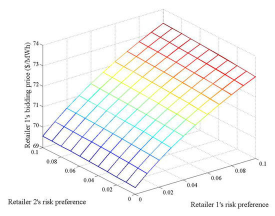 The above results also indicate that, for a certain retailer, when its rival retailer’s risk-averse level goes up, this retailer may have a chance to enhance the retail bidding price by bidding more strategically, occupy a larger market share, and make more profit.