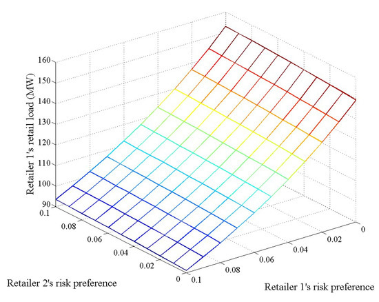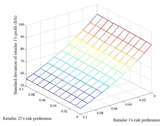 When the two retailers are risk-neutral, i.e., , their equilibrium retail prices, retail loads, and expected profits are 69.33 $/MWh, 149.33 MW, and 1.394 × 103 $/MWh, respectively. These equilibrium outcomes remain unchanged when the uncertainty of wholesale price varies (i.e., with different standard deviation values).