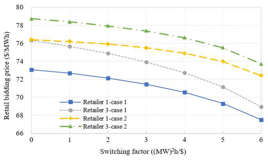 It can be seen from Figure 7 that the bidding prices of Retailers 1 and 3 will decrease as switching factors increase in both cases, thus demonstrating that consumers’ switching behavior can contribute to the mitigation of retailers’ market power abuse. Moreover, under the same , the magnitude of decrease in Retailer 3’s bidding price is larger than that of Retailer 1. In other words, the more risk-averse a retailer is, the more obvious the mitigative effect of consumers’ switching behavior on its market power will be.