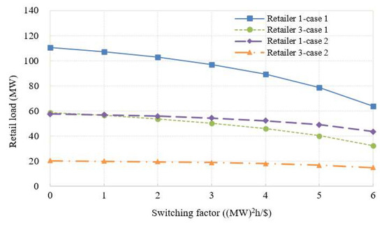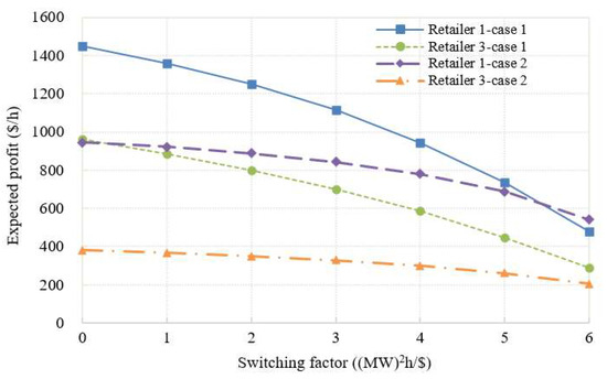 The retail loads from Retailers 1 and 3 will drop with the increase in switching factors because the mitigation in the retailers’ market power will result in a fall in their willingness to offer electricity in the retail market [21], as shown in Figure 8. Accordingly, Retailers 1 and 3’s expected profits and standard deviations of profits will decrease as switching factors increase in both cases, as shown in Figure 9 and Figure 10.