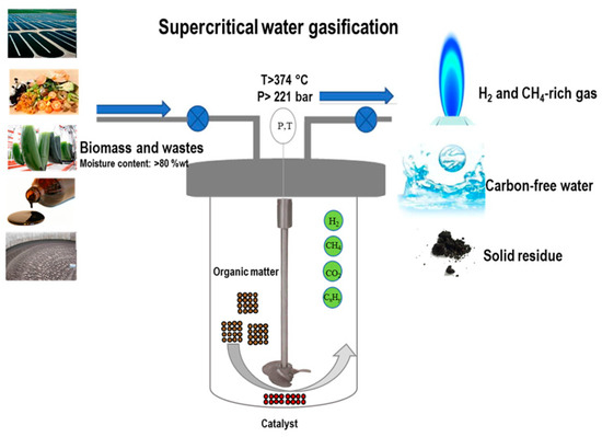 - Correa, C.R.; Kruse, A. Supercritical water gasification of biomass for hydrogen production—Review. J. Supercrit. Fluids 2018, 133, 573–590. [Google Scholar] [CrossRef]