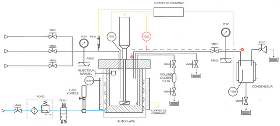The tests were carried out in a 500 mL batch reactor (provided by Top-Industrie, Vaux-le-Pénil, France, Figure 2). The reactor is made of 1.4571 stainless steel (containing between 16–18% of Cr and 10.5–13% of Ni). The maximum operating temperature of the reactor is 650 °C, and its maximum operating pressure is 400 bar. The temperature inside the reactor is measured by a type K thermocouple; the pressure is monitored by a sensor and a manometer. A known mass of feedstock (~10 g) is introduced into the reactor. Then, it is closed, and the tightness is tested three times (each test takes ~10 min with 70 bar of nitrogen). After sweeping with nitrogen to an inert atmosphere, the pressure is adjusted to 7–8 bar with nitrogen. The reactor is then heated (~5 °C/min), and the stirrer is set at 300 rpm.