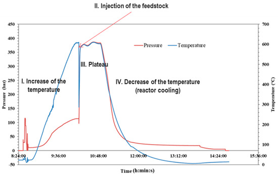 Once the reactor reaches the set temperature, 50 g of feedstock is injected with a piston cylinder. During the injection of the feedstock, the temperature in the reactor decreases, and after injection, the temperature increases rapidly (in less than 3–5 min) until the set-point at supercritical conditions (this time represents the beginning of the holding time t = t0, Figure 3).