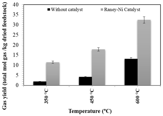 The results obtained with the Raney nickel catalyst follow the same trend as those without catalysts (Figure 4). It means that by increasing the temperature, the gas yield is highly improved from 11.5 mol gas/kg of dried feedstock at 350 °C to 32.4 mol gas/kg of dried feedstock at 600 °C, which represents an improvement of the gas production of 2.5 times higher in comparison to non-catalytic process at 600 °C.
