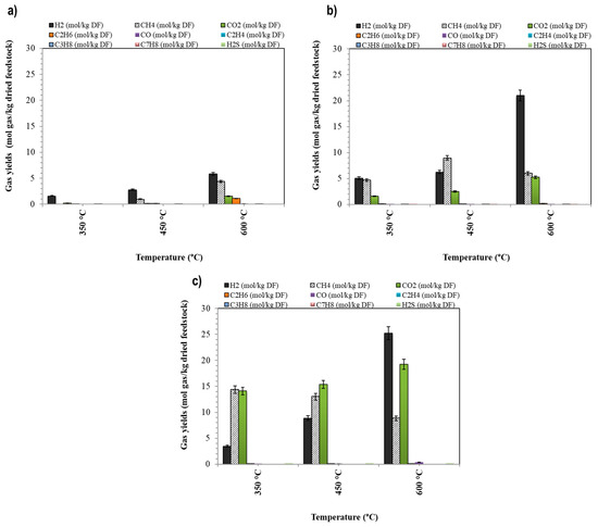 Temperature is an important parameter affecting the conversion yield of the feedstock in the process. The effect of temperature has been studied at three different levels (350 °C, 450 °C, and 600 °C) with and without catalyst at the same holding time (30 min). The results in Figure 4 confirm that at higher temperatures, a major conversion of the organic matter into gas molecules was obtained. The results without catalyst indicated that by increasing the temperature from 350 °C to 600 °C, the gas yield is enhanced (from 1.9 mol gas/kg of dried feedstock to 13.1 mol gas/kg of dried feedstock). This represents an improvement of the gas production of six times higher at 600 °C (without catalyst). These findings are in agreement with those reported in the literature [5,13,14].