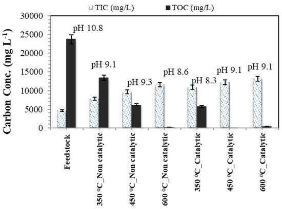 However, the total inorganic carbon (TIC) was also favored by increasing the temperatures from 5 g/L contained in the feedstock to 13 g/L at 600 °C. A fraction of this TIC could be attributed to the partial CO2 dissolution in water, which leads to the formation of carbonate species. The pH of the remaining aqueous phase was slightly basic (between pH 8.3 and 9.3). The change in pH from pH 11 (initial feedstock) to pH 8–9 (aqueous phase) was also observed by Curmi et al. [12], and it was attributed to the partial dissolution of CO2 in water, which contributes to the formation of carbonates, increasing the inorganic carbon content (TIC).