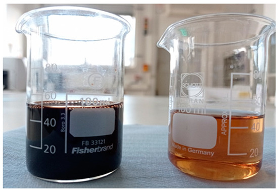 The carbon analyses on solid and gas phases revealed that at the best favorable conditions (i.e., catalytic SCWG from 450 °C), most of the carbon content was found in the gas composition, representing more than 50% w/w. It was found that the Raney nickel catalyst contributes to reducing the char formation at least three times lower in comparison to the non-catalytic process. Thus, the gas phase has a high calorific content since the reactions of methane and hydrogen production are also favored (Equations (1)–(4)). Figure 7 shows the black liquor feedstock before and after SCWG treatment. In summary, it was demonstrated that SCWG could be used as an alternative step for wastewater treatment since the carbon content can be valorized in gas, and the organic compounds in the residual water are converted.