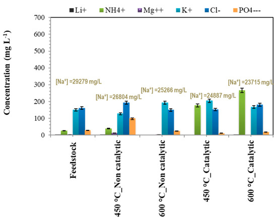 The cations and anions concentrations were determined by the ion-chromatography technique. The results in Figure 8 show that the main elements present in the feedstock (before the SCWG process) follow this trend Na+ >> Cl− > K+ > NH4+~PO4−3 > Mg+2. It was found that ammonium ions concentration increased ten times, from 24 mg/L (initial feedstock) to 265 mg/L (at 600 °C in the presence of the catalyst). This can be explained by the possible deamination of amine compounds present in the black liquor-based effluent, which conduct the formation of ammonium. Another possible explanation is the so-called HABER process, which is related to the reaction of N2 with hydrogen to form ammoniac in the presence of nickel and iron (reactor walls effect); this could conduct the formation of ammonium (Equations (7)–(9)):