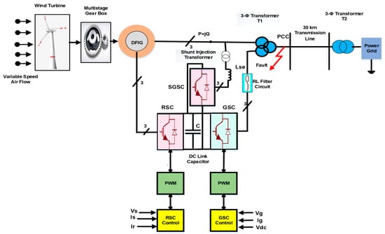 The structure of the paper is described below. In Section 2, the problem formulation for DFIG is presented, which considers both symmetrical and asymmetrical faults. Section 3 reports the mathematical modeling of a wind turbine and DFIG. Section 4 elaborates the vector control structure using a PI controller for DFIGs. Section 5 discusses the auxiliary hardware using a shunt-transformer-interfaced SGSC system configuration incorporated with the stator of the DFIG. Section 6 addresses the effects of simulation for asymmetrical and symmetrical faults. Section 7 contains the conclusions of the work.