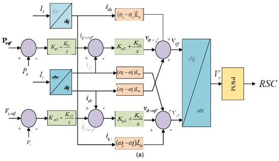 For the RSC, independent control is achieved for active power and terminal voltage through and , respectively. Figure 4 shows PI-controlled RSC control. The rotor-side converter is d and q is the current control reference. indicates the specified terminal voltage reference. as given in Equation (28) refers to active power control.
