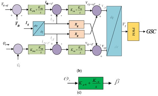 In Figure 4, the GSC independently controls injected from the power grid and adjust the VDC at a nominal rating. and are used for independent control of VDC and . is the dc link voltage reference, and refers to the reactive power control reference. is the transformer–transmission line reactance, expressed in Equation (29):