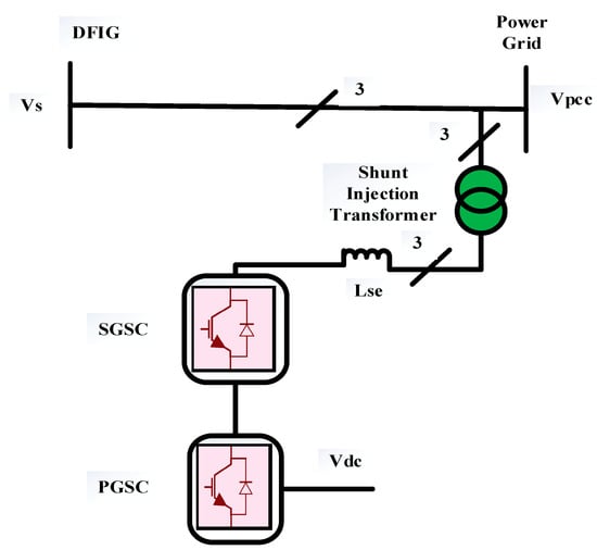 Flannery and Venkataramanan suggested adding a grid-side converter in series with the generator’s stator windings to improve the LVRT performance of the DFIG during symmetrical faults [38]. The shunt injection transformer interfaced with a SGSC in Figure 5 is employed to compensate for PCC voltage dips caused by symmetrical faults. It improves LVRT by ensuring DFIG stator terminal sinusoidal voltage. The SGSC offers active series filtering, reactive power compensation, and electronic isolation [35].