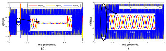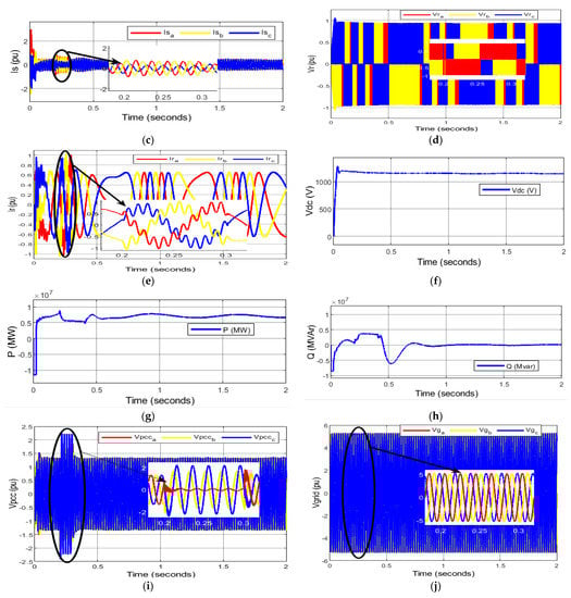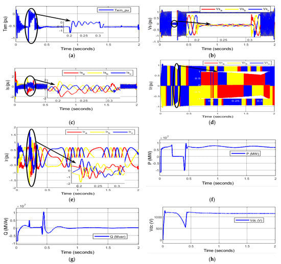 Apart from it, in the pre-fault period, the machine accelerates its speed and acts as the doubly fed induction motor (DFIM) until it reaches the rated speed. Later on, the active power output is suddenly reduced to zero during the fault period and undergoes a sharp decrement in power at the clearance of the fault. On the other hand, the reactive power fluctuates above 0 MVAr—providing grid support to the DFIG-based WECS during the fault—but undergoes a steep increment in reactive power at the clearance of the fault as shown in shown in Figure 7f,g respectively. As soon as the three-phase fault is over, the active power output increases significantly. Similarly, reactive power maintains 0 MVAr, thereby allowing the DFIG to export the active power to the grid. The VDC rises above the nominal value as observed in Figure 7h at the instant of fault and it rises after the clearance of the fault. The ripples in the VDC are due to the transients in the Ir. Figure 7i shows that the terminal voltage at PCC also approaches 0 pu during the fault period. However, an overshoot in Vpcc is noticed after the post-fault period. The grid voltage also suffers from voltage sag as seen in Figure 7j due to the three-phase fault causing a serious power quality problem.