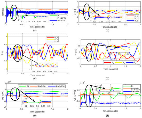 The LVRT improvement requires the incorporation of a shunt injection transformer interfaced with the SGSC during three-phase faults. The proposed technique is compared with PI and PI + DIFCL control schemes. The electromagnetic torque oscillations become zero during the fault. However, these torque oscillations experience a peak value at the start and end of symmetrical faults as shown in Figure 8a. The DFIG performance is hampered by these rapid and massive torque variations, having a peak value of 1.5 pu at 0.21 s by the PI controller. The proposed SGSC scheme provides better and faster stabilization by reducing the peak value to 1.24 pu during the same period. On the other hand, the PI and PI + DIFCL control schemes give a peak rotor current value of 1.553 pu and 0.437 pu at 0.22 s, respectively, as shown in Figure 8b. Therefore, the proposed technique significantly reduces rotor current transients and maintains its value at 0.35 pu, which improves the transient performance of the rotor of the DFIG. The active power output using a PI controller acquires a peak value of 9.8 MW at 0.33 s as shown in Figure 8c, but the proposed technique provides 5.54 MW, showing less overshoot during the same period. Lastly, the reactive power has a peak value of 6.8 MVAr and 7.4 MVAr using the PI and PI + DIFCL control strategy at 0.326 s, as shown in Figure 8d. The proposed control scheme has a value of −9.87 MVAr. The lower value of reactive power is advantageous; therefore, the proposed technique gives better output with minimum oscillations.