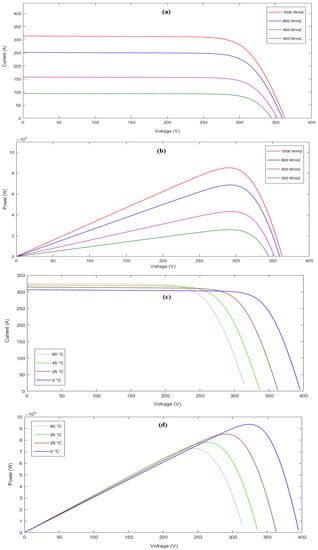 The two most important factors that determine the maximum power that can be obtained in PV energy systems are the solar irradiation and the temperature. The power obtained from the PV panel is calculated by multiplying the panel voltage and the current. There is a standard test condition for PV energy systems. This condition is used to assess the efficiency of PV energy systems. In the datasheets of PV panels, there are generally values in these standard test conditions. In the power–voltage characteristic curve, there is a maximum power generated for a given voltage and current value. Standard test conditions are defined as 1000 W/m2 irradiance and 25 °C temperature [40]. However, these conditions may not be met continuously. Changes in irradiation and temperature also affect the output current and voltage of the PV panel [41]. Figure 3 shows the effect of the PV panel at different irradiance and temperature values on the current–voltage and power–voltage characteristic curves.