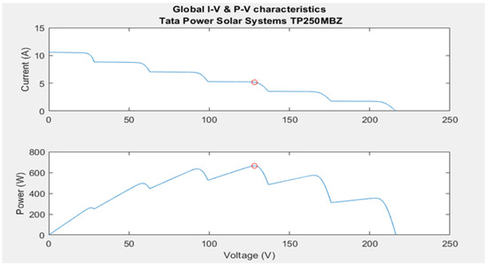 As a result, the physical structures of the PV panels due to overheating are damaged. To prevent such undesirable situations, bypass diodes are added to all PV panels in parallel. Bypass-connected diodes are passive in normal operation, where they are not subject to partial shading. That is, they do not affect the system. However, when exposed to partial shading, diode circuits connected to the bypass in the PV panels with shading become active and take precautions against the hot-spot event. In addition to all these benefits of bypassing connected diodes, they also have different problems. One of these problems is the inability to produce power or energy on the PV panel, which is exposed to partial shading where the bypass-connected diode circuit operates. Thus, the maximum power value decreases. Due to the presence of bypass-connected diodes, peaks occur in the power–voltage characteristic curve of the PV energy system as often as the number of different irradiations. As a result, the system becomes complex [44]. The power–voltage and current–voltage characteristic curves of the PV panel obtained for the complex shading condition are given in Figure 4.