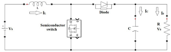 DC–DC converters are electronic circuits that are widely used to convert unregulated DC input power to regulated DC output power at different voltage and current levels [45]. They are used to adjust and control the varying output power of solar panels to ensure that the operating point is always at MPPT. This can be accomplished using one of the MPPT techniques to change the duty cycle (D) applied to drive the converter [46]. The DC–DC boost converter is one of the most widely used topologies among power electronics circuits. It is used in applications where the output voltage is required to be higher than the input voltage. The desired output voltage can be obtained by changing the duty cycle applied to the switch under a fixed frequency [47]. The relationship between D, the input voltage Vin and the output voltage V0 of the boost converter is shown in Equation (6). The boost converter circuit is shown in Figure 5.