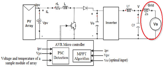 Figure 6 shows a two-stage grid-connected system. The purpose of the DC–DC boost converter in early stages of the process is to control the voltage of the PV array so that electricity may be gathered. An inverter controls the DC–DC converter’s output voltage while also producing the AC voltage needed for connecting the solar system with the grid during the second stage. Coupling among the two stages is minor due to the presence of a DC link capacitor among the boost converter as well as the inverter, allowing them to be investigated independently.