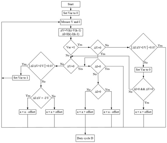A successful MPPT method provides a balance between tracking speed and steady state. In line with these conditions, the conventional incremental conductivity algorithm may not be able to properly track the MPPT in the case of a sudden change in irradiation. This can lead to low power efficiency [60]. For this reason, the idea has emerged of developing a conventional incremental conductivity algorithm. The flowchart diagram of the proposed MIC for maximum power point tracking is shown in Figure 10.