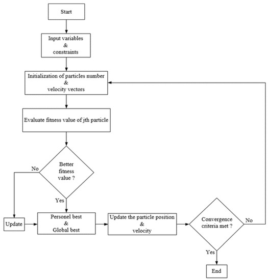 The PSO algorithm, which is among the most popular bio-inspired algorithms, is a probabilistic technique developed by Eberhart and Kennedy in 1995. The basis for this optimization was laid by observing the social behavior of creatures that move in flocks, such as birds and fish [63]. PSO is an unconventional, smart, easy-to-understand, and effective approach [64]. PSO handles the solution of the optimization problem in an n-dimensional field in the following way: Everyone arranges their flight direction according to their flight direction, as in bird flocks and the flight direction of the whole flock. In other words, in this method, individuals benefit from their past experiences of themselves and of the whole swarm. Everyone in this n-dimensional field is called a particle. Particles are used to provide searches for the optimal point. Therefore, each particle helps in the analysis of the optimization [65]. The flowchart diagram of the PSO algorithm is given in Figure 11.