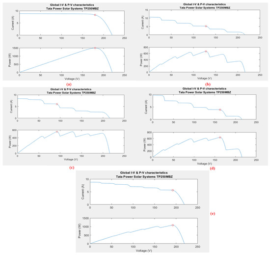The current–voltage (I-V) and power–voltage (P-V) characteristic curves under different shading conditions are given in Figure 12. The first uniform irradiation condition (UIC) graph is given in Figure 12a. In the power–voltage graph in Figure 12a, only one peak occurs as each panel receives equal irradiance values. The maximum power value of this point is 1494 W. The second complex partial shading condition (CPSC) graph is given in Figure 12b. In Figure 12b, the global maximum power point is 664 W. The third CPSC graph is given in Figure 12c. In Figure 12c, the global maximum power point is 554 W. The fourth CPSC graph is given in Figure 12d. In Figure 12d, the global maximum power point is 634 W. The fifth CPSC graph is given in Figure 12e. In Figure 12e, the global maximum power point is 1080 W.