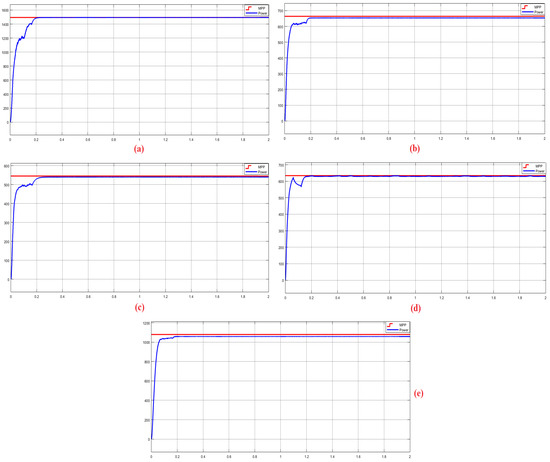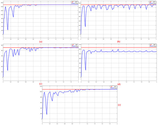 The power–time graph of GWO under different shading conditions is given in Figure 13. The first UIC graph is given in Figure 14a. When the first UIC graph is examined, it is seen that 1493.9 W power was obtained. It reached the global maximum power point in 0.25 s and maintained its stability. There was no oscillation. The efficiency of the system was calculated as 99.99%. The second CPSC power-time graph of GWO is given in Figure 14b. In Figure 14b, 653.5 W power was obtained. It reached the global maximum power point in 0.2 s and maintained its stability. There was no oscillation. The efficiency of the system was calculated as 98.41%. The third CPSC power-time graph of GWO is given in Figure 14c. In Figure 14c, 548.5 W power was obtained. It reached the global maximum power point in 0.29 s and maintained its stability. There was no oscillation. The efficiency of the system was calculated as 99.00%. The fourth CPSC power-time graph of GWO is given in Figure 14d. In Figure 14d, 630 W power was obtained. It reached the global maximum power point in 0.21 s and maintained its stability. There was no oscillation. The efficiency of the system was calculated as 99.36%. The fifth CPSC power-time graph of GWO is given in Figure 14e. In Figure 14e, 1061 W power was obtained. It reached the global maximum power point in 0.19 s and maintained its stability. There was no oscillation. The efficiency of the system was calculated as 98.24%.