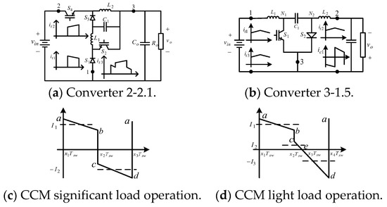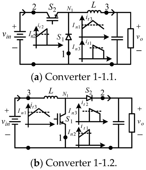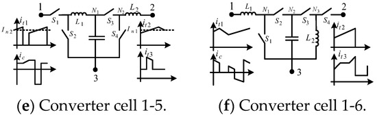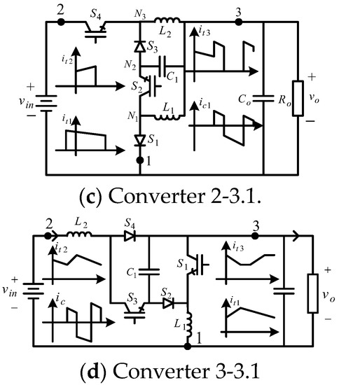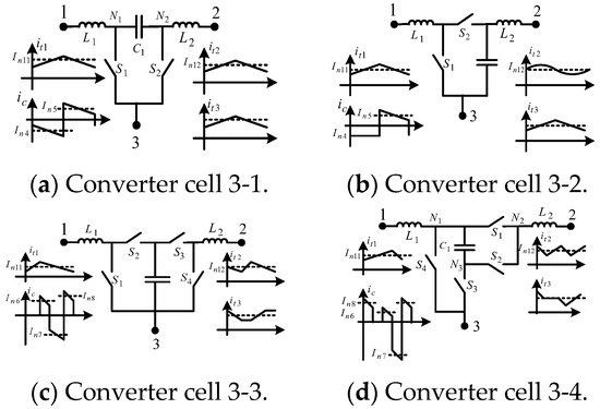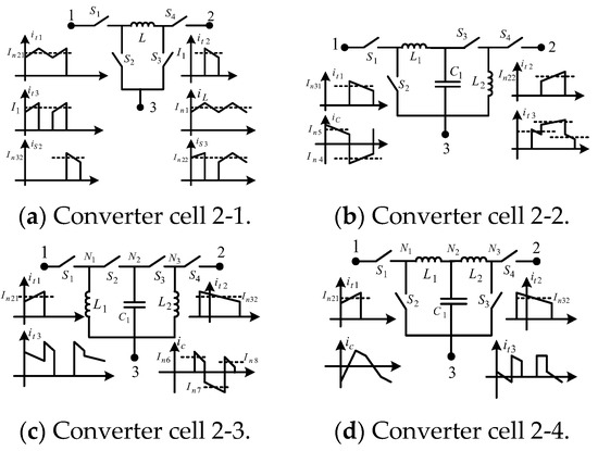 Figure 5 shows converter cell 1-1 and three of the six possible DC–DC converters derived from converter cell 1-1. Converter cell 1-1 comprises a single type-1 BBB [35]. The current signals generated at the terminals of converter cell 1-1 when operating in CCM are shown in Figure 5 and Figure 6.