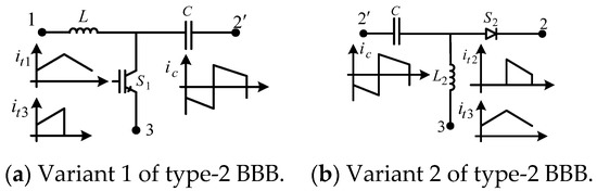 The DC–DC converters shown in Figure 11a,b are realized using at least one type-2 BBB. They generate capacitor currents as shown in Figure 11c,d. It is also seen that the capacitor current waveform changes with load.