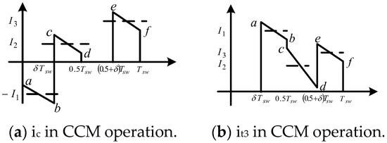 Current signals generated at terminals one, two, and three of converter 3-3.1 and current through the decoupling capacitor during CCM operation are as shown in Figure 6c and Figure 17a,b, respectively.